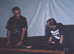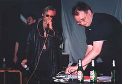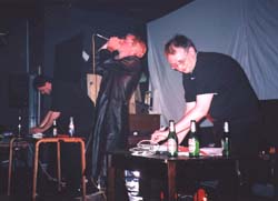 Wertham Hinoeuma, Red Rose Club, London ![]() Given the colossal sound Whitehouse are associated with it's quite astonishing to see just how little equipment they use. It's split over two tables tonight: Best's Roland, Sotos' WASP and, uh, Bennett's microphone. They take to the stage to a torrent of verbal abuse before launching into the classic Whitehouse set-opener, 'Tit Pulp'. It becomes obvious quite early on that Peter Sotos rarely touches his WASP, and if so only to alter pitch. He prowls the stage, inciting not so much violence but taunts and jeers. Occasionally he'll let loose with some spit onto the floor, other times it's a mouthful of beer spurted into the crowd with precision aiming directed at the chief offenders. Besides being a prime influence on William Bennett one may wonder what exactly is his role in a Whitehouse Live Action, aside from stalking the stage. However his dark demeanor, sexual proclivities and interests as expounded in 'pornographic' titles such as Tick, Index and Lazy, ensure a deserved place within the Whitehouse ranks. Philip Best, meanwhile, is perhaps the chief antagonist but he's conversely the most good-humoured. With round spectacles and chubby fat he's more like a guilty schoolboy than an extreme music virtuoso. He lunges with his vocals as he opens the set with 'Tit Pulp'. He's the Whitehouse noise supremo and mid set while Bennett and Sotos have sauntered off-stage he indulges in a noise-fight with the crowd. ![]() When William Bennett dj'ed earlier this year at the Hinoeuma club, he looked surprisingly young and stylish - tonight he's in his Whitehouse guise dressed in black jeans, long leather jacket, sporting glasses from which his greased hair overhangs. He looks sleazy, intimidating - perhaps just like a pimp. It also surprisingly rock 'n' roll especially when he thrusts his arm into the air, Las Vegas style. Bennett's the most frenzied - dribbling beer, grabbing his crotch, and furtively shaking his microphone in an act of masturbation screaming 'Thank Your Lucky Stars'. The paced is slowed when William Bennett reads a short story which at times just sounds like a recipe, of course, there's enough incisive twists to elevate this from Delia Smith to domestic abuse via eating disorders. Things get frenzied again during a brutal rendition of 'A Cunt Like You' where the microphone is passed between a screaming Best and a raging Bennett. This is when Whitehouse are at their most potent and intimidating. Even if the threat of a Whitehouse show is now more implied than actual it's not a reason to doubt their power or even to undermine them. After 20 or so years, Whitehouse are still managing to develop; their sound has matured, their interests have become subtler but the overall effect has not been diminished. It's just in a venue like this - it's a noise club - where the crowd know what to expect and Whitehouse know what to deliver the element of surprise is removed. No one goes home disappointed, though. This is prime Whitehouse, not to be missed. ![]() Tonight he is producing industrial noise with Italian noise artist Marco Wertham sharing electronics. As the machines bleed, Wertham takes the microphone and screams from the front of the stage. Murphy, resplendent in his Moon Lay Hidden Beneath A Cloud T-shirt, remains behind his equipment. Above a screen shows scenes from The Eternal Jew, Pasolini's Salo and World War 2 atrocities. I believe this was more John Murphy assisting with Wertham's project - either way, they produced a satisfactory slab of atmospheric industrial noise and I for one was glad to hear John Murphy perform away from his usual percussive duties. It's just a great pity that this collaboration had to languish at the end of the night when many people had already left to catch their travel connections home. Key Resources: Whitehouse - http://www.susanlawly.com For details of Kraang's Uro (1981 - 1983) LP go to Tesco Distribution www.tesco-germany.com or www.tesco-distro.com Photography by Compulsion online |