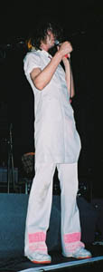 persuasive minimal presentation with maximum effect.There's an extrovert showman in Angus Andrew, frontman of US guitar-funk outfit Liars. How else can you explain the dress and tiger's tail he's wearing tonight. Perhaps they're wardrobe discards from girlfriend Karen O, lead singer of hipper-than-hip outfit the Yeah Yeah Yeahs. Liars make great avant-funk-noise. They Threw Me In A Trench and Stuck A Monument On Top was certainly one of the highlights of last year from the current crop of US guitar bands. The way Andrew prowls the stage with his craggy features and straggly hair are reminiscent of Nick Cave fronting the Birthday Party and Gibby Haynes from the Butthole Surfers. Liars showcase their latest album They Were Wrong So We Drowned, an experimental concept album based on the folklore of witches, encompassing folktales to witch trials, with atonal guitar, hyper rhythms and a general anything goes attitude. Where they go next is anyone's guess but their mixture of avant-funk-noise certainly enthralled a vast proportion of the Glasgow crowd. Liars